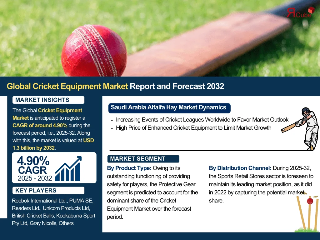 The Global Cricket Equipment Market Size size was valued at USD 0.93 billion in 2025, further projected to be about USD 1.3 billion by 2032, and would register a CAGR of around 4.90% during 2025-32. The cricket gear includes a bat, a ball, batting gloves, wicket-keeping gloves, an abdomen guard, a forearm guard, a thigh guard, shin pads, leg pads, a stump, bails, and other items. The equipment is designed & manufactured in accordance with the preferences & feedback from the consumers. Reliant on the equipment size & product, varied raw materials are utilized. Also, the cricket equipment sector is being compelled by the mounting construction of stadiums. Further, high-quality cricket equipment is essential to outfit the stadiums that are being built or rebuilt to meet the rising demand for cricket matches & tournaments.