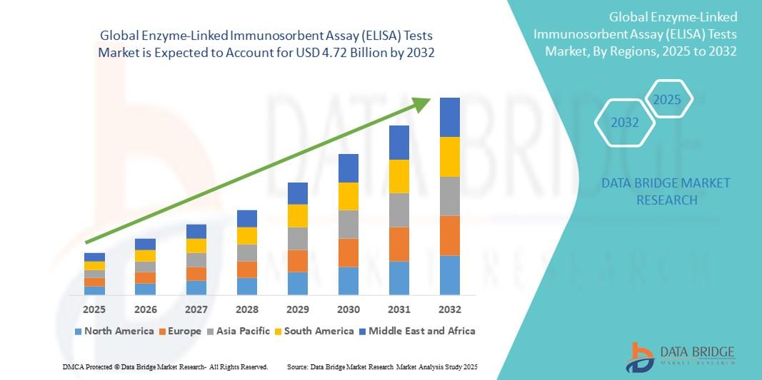 - The global enzyme-linked immunosorbent assay (ELISA) tests market size was valued at USD 2.70 billion in 2024 and is expected to reach USD 4.72 billion by 2032, at a CAGR of 7.23% during the forecast period