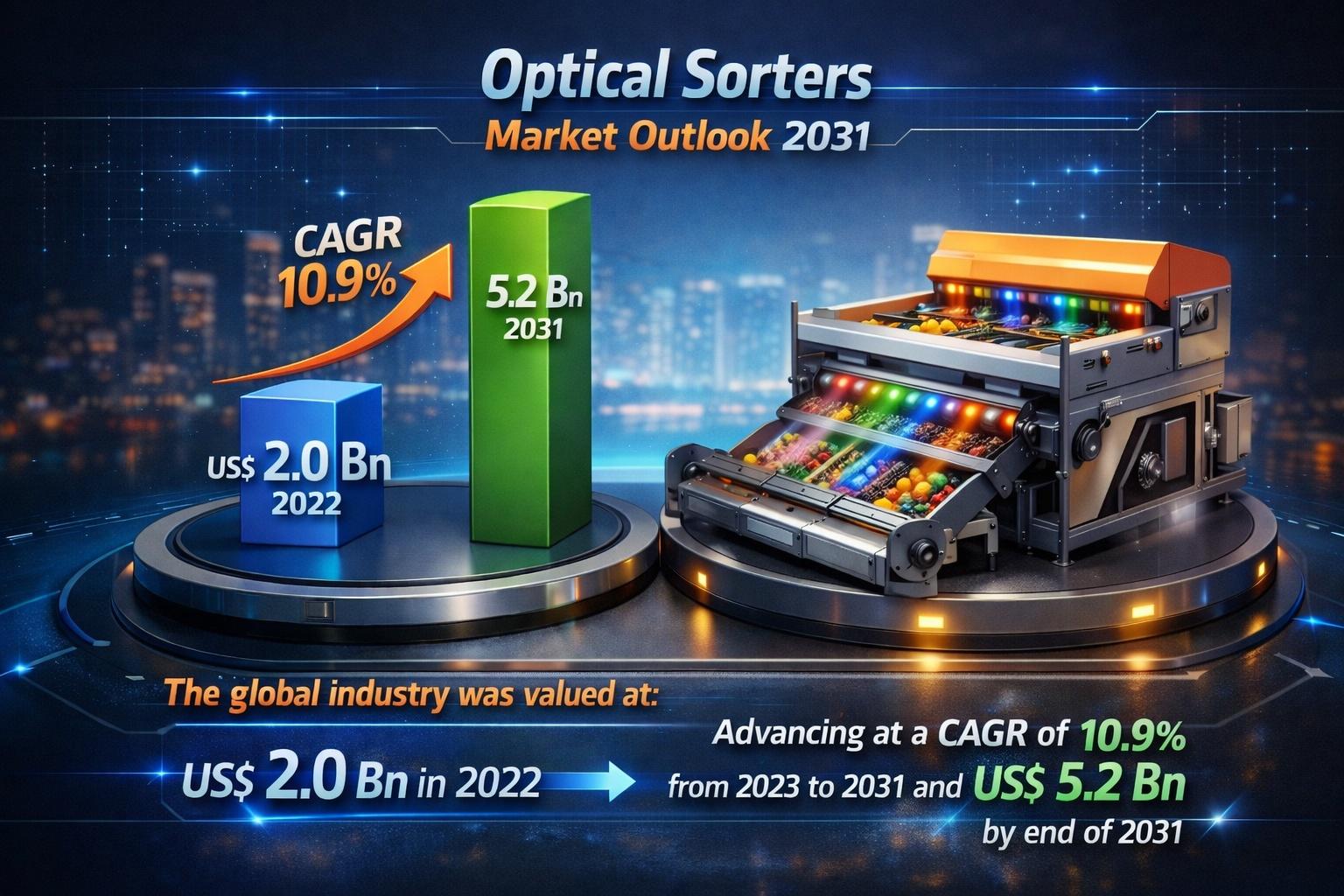The global optical sorters market is witnessing strong momentum as industries increasingly adopt automation to improve quality, efficiency, and compliance. Valued at US$ 2.0 billion in 2022, the market is expected to expand at a CAGR of 10.9% from 2023 to 2031, reaching US$ 5.2 billion by the end of 2031. This growth reflects the rising need for high-accuracy sorting solutions across food processing, waste recycling, mining, and other industrial applications.