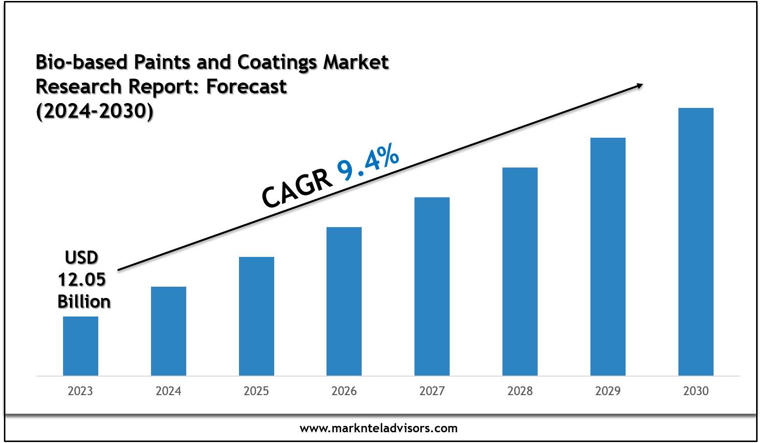 The Global Bio-based Paints and Coatings Market size is valued at USD 12.05 billion in 2023 and estimated to grow at a CAGR of around 9.4% during the forecast period, i.e., 2024-30. Stringent environmental regulations and sustainability initiatives imposed by governments and organizations worldwide have been driving the demand for eco-friendly and low-VOC (volatile organic compounds) coatings. These paints and coatings are derived from renewable sources owing to which they have reduced environmental footprint. As a result, they are in alignment with sustainability norms, leading to increased adoption in applications such as architectural & construction, automotive, furniture and woodwork, packaging, etc.